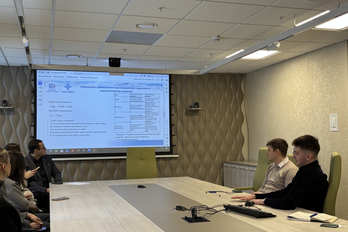 Следующий докладчик, Кирилл Алексеевич Алькин (ПАО «НПО „Алмаз“»), погрузил аудиторию в проблематику скрытых затрат. Его исследование было посвящено созданию формализованной модели расчёта трансакционных издержек, возникающих в процессе регламентного согласования договоров. Новаторство подхода заключается в операционализации этих издержек на основе данных журналов событий корпоративных систем. Модель разбивает затраты на трудовые, IT, управленческие компоненты, а также оценивает стоимость задержек и рисков. Центральным элементом стала концепция «нормативной границы» издержек, при превышении которой модель рекомендует определённые управленческие действия — от приоритизации до пересмотра целесообразности сделки.